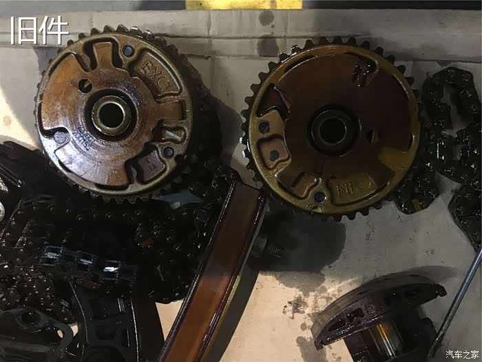 拆卸下来的正时调节轮及链条和涨紧器,肉眼上面其实很难看得到有什么变化,只有经过仪器的测量才知道。但是这些细小的变化会在发动机运行的时候直接的体现出来。没个缸盖上面两个正时调节轮,一共是四个。我看到链条的导轨上面也已经磨出了明显的痕迹,这种痕迹应该是机油的润滑程度不够造成的。发动机运转的时候会发出明显的噪声。
