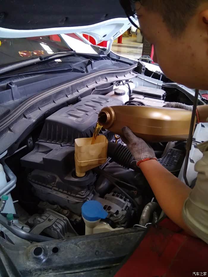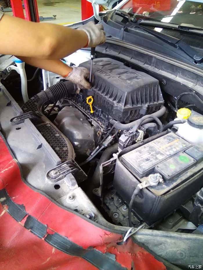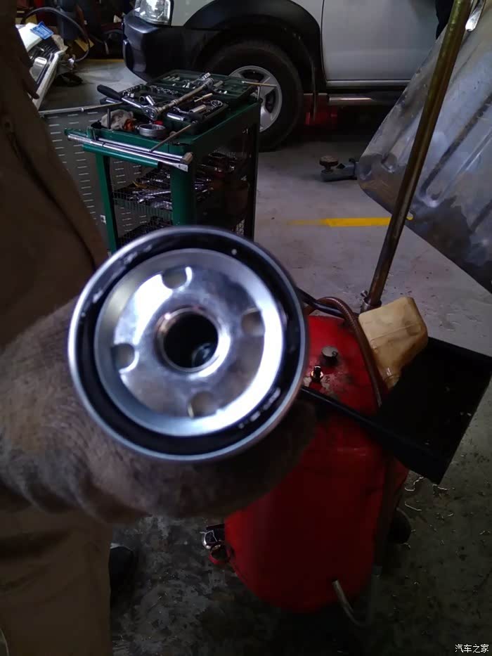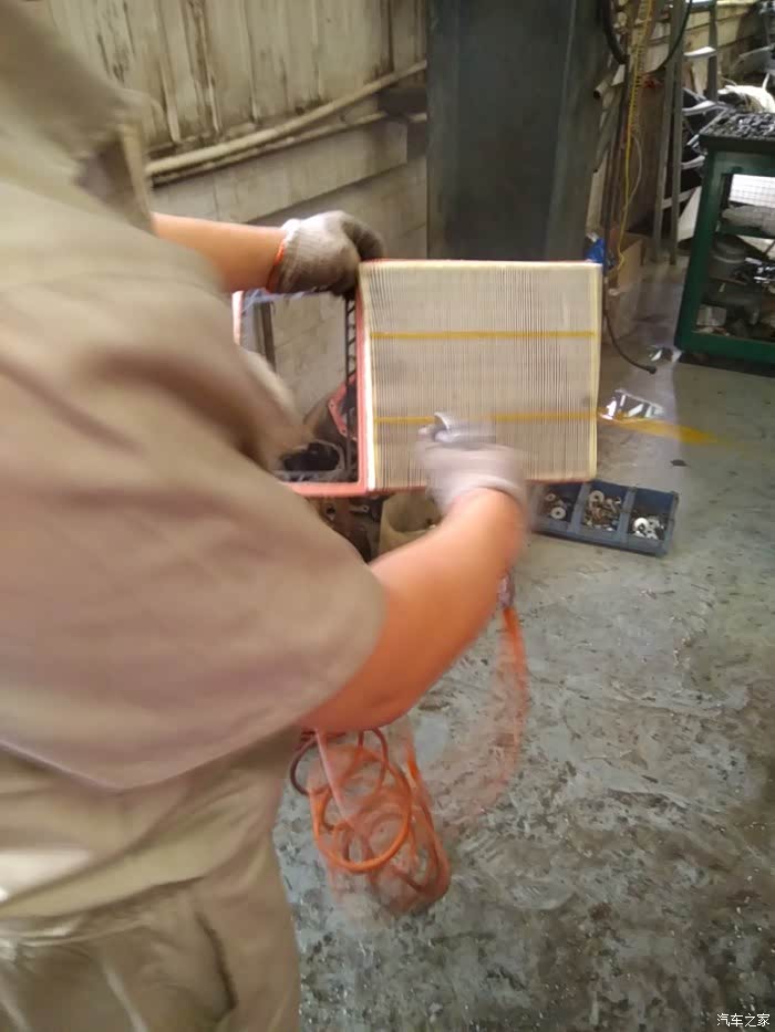 师傅换上了新的机油。机油更换完成后,师傅拆开了空气滤清器,取出了里面的滤芯。滤芯也是沾满了灰尘,当师傅用工具清理滤芯时,整个一个尘土飞扬的景象。