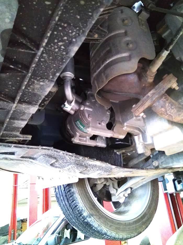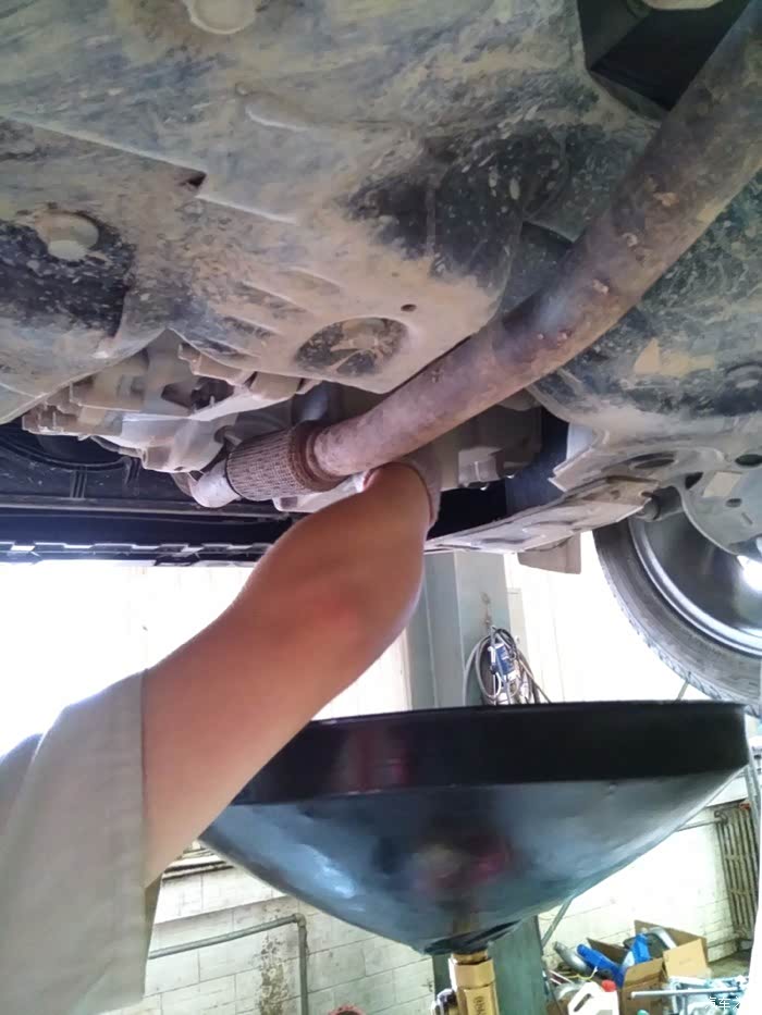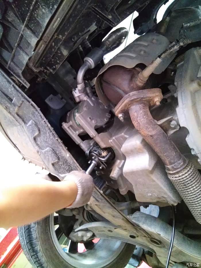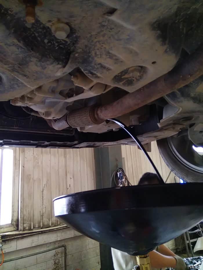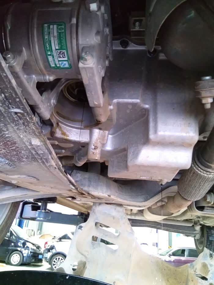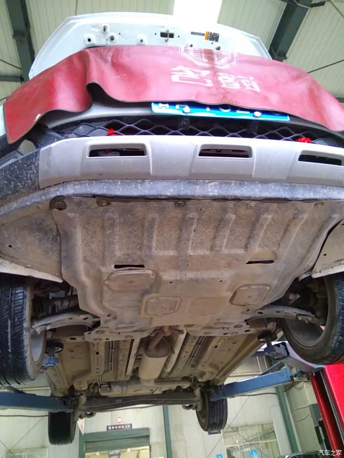 师傅用工具吹了一下灰,清理了灰尘之后,师傅将我的爱车举了起来。为了更换机油和机滤,需要先把下面这个盖板拿下来。由于螺钉比较多,师傅花了很长的时间。