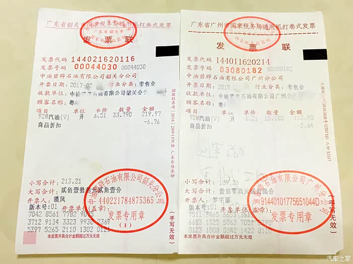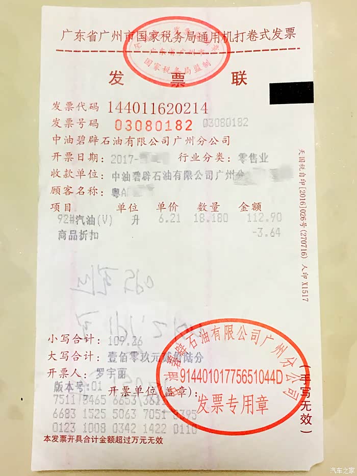 加油小票,本次测试以加满为准的所需油量。