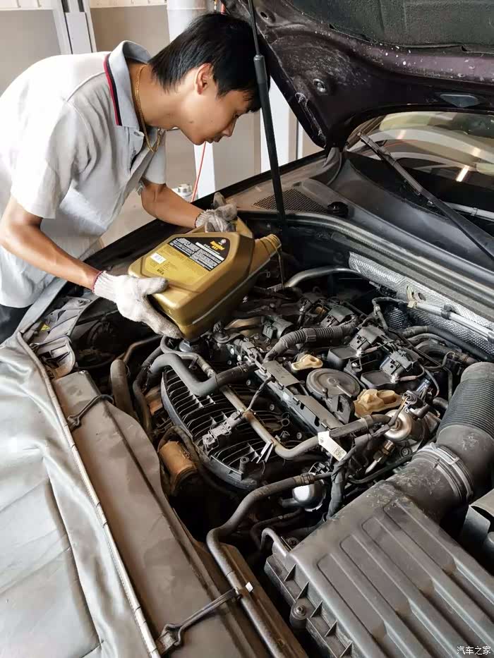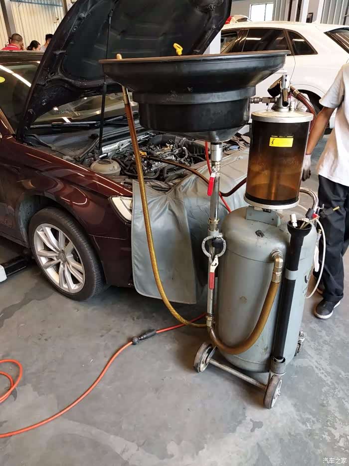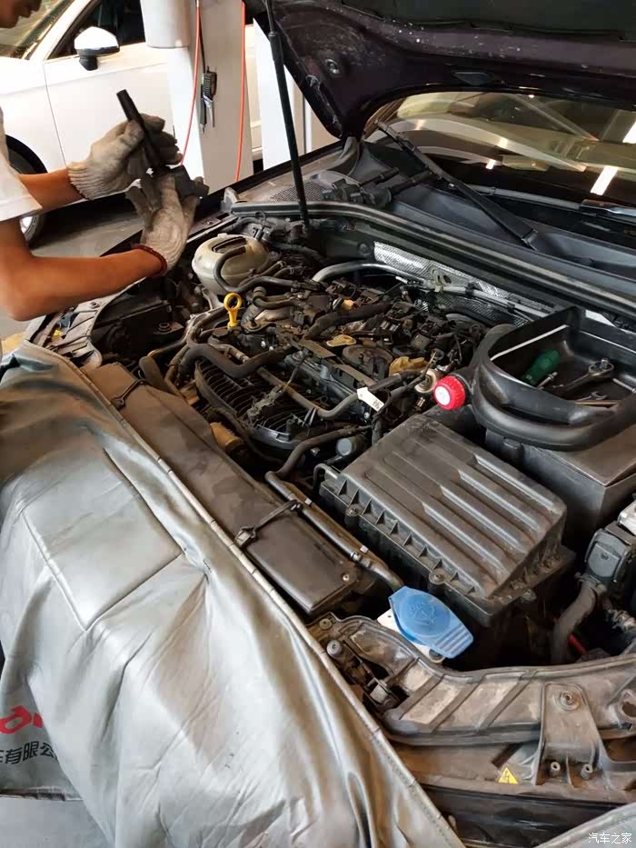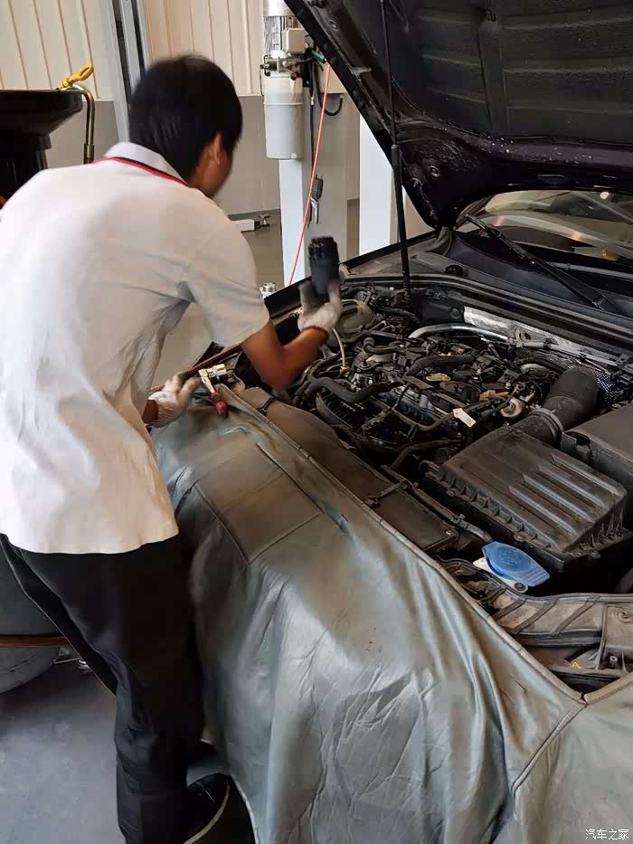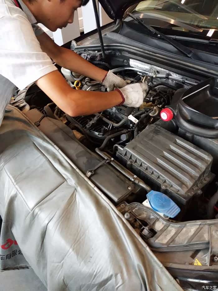 抽机油的同时,小师傅在换机滤,EA888的发动机机滤是在上面的,换机滤很方面的。