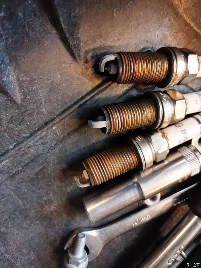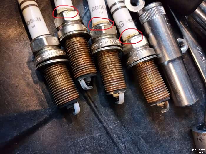 4支火花塞全部拆好,烧了2.4万公里的样子,红圈处已开裂变黄,看来直喷增压发动机还是挺耗火花塞的。