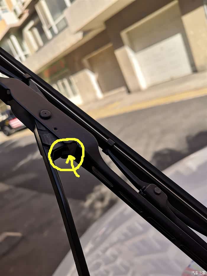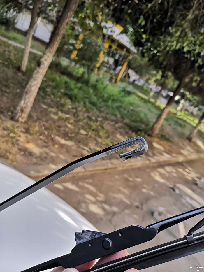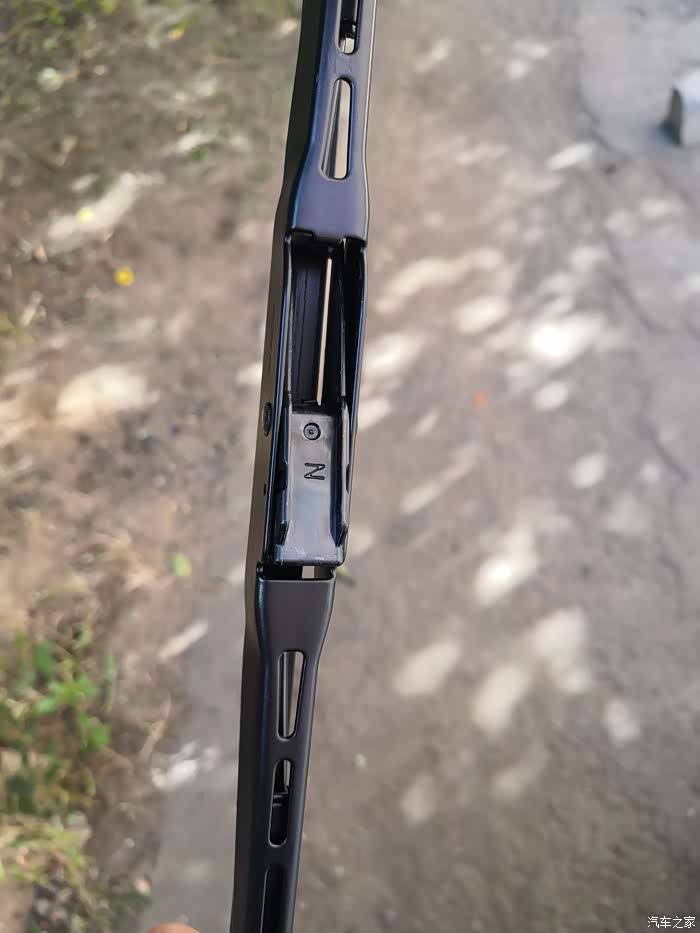 这就是拆下雨刷片后的样子,就是一段弯弯的钩子,现在明白为什么要向车的方向用力才能拆卸下来吧,因为开口方向朝下。