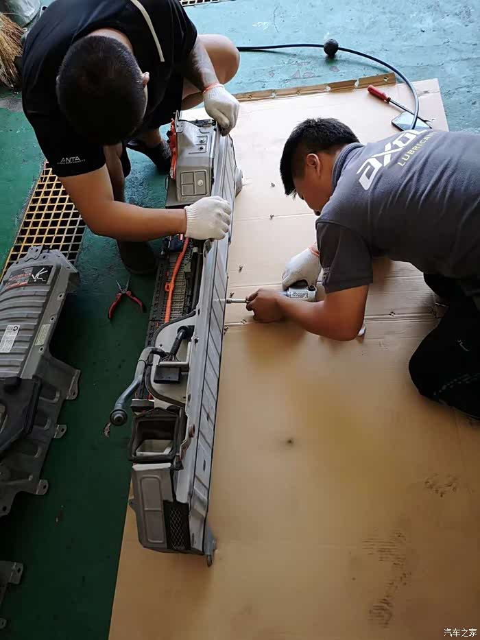 将电池抬下来拆铜牌、进行电池更换 周师傅蹲着脚都蹲麻 姿势霸气