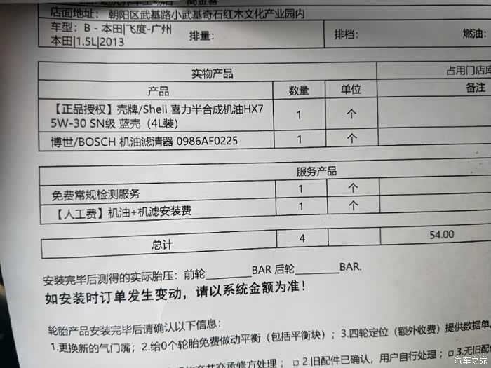 机油机滤加工时费,结算价格54,太超值啦!因为上次贴了虎子家的车贴,免费送了一瓶冬季玻璃水,哈哈。