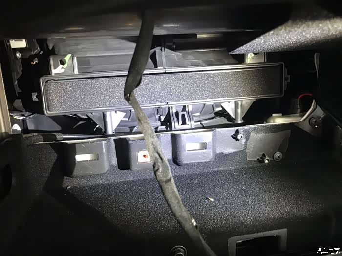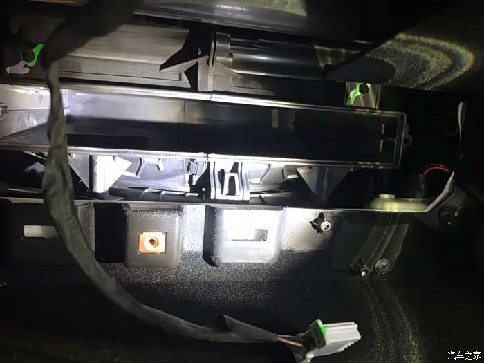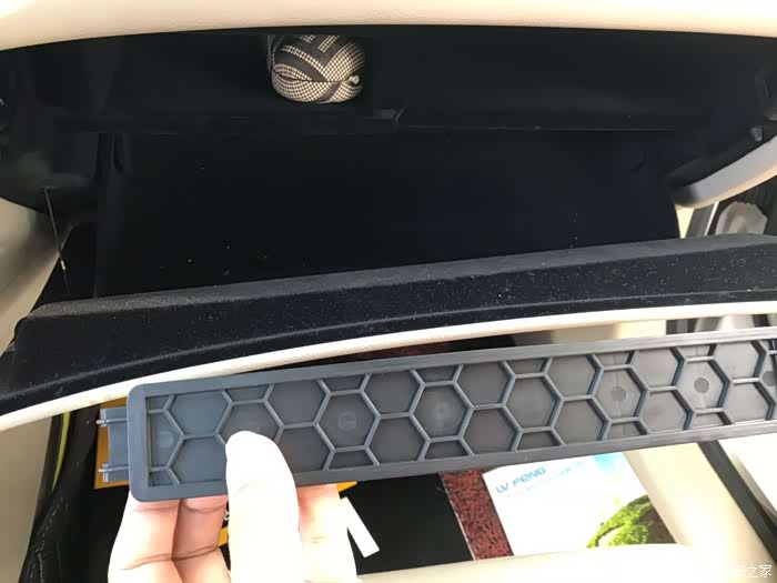 小心拉出来,因为隔层上有个电灯线,把插头拔掉,就可以把空调滤芯的卡扣盖板手扳出来