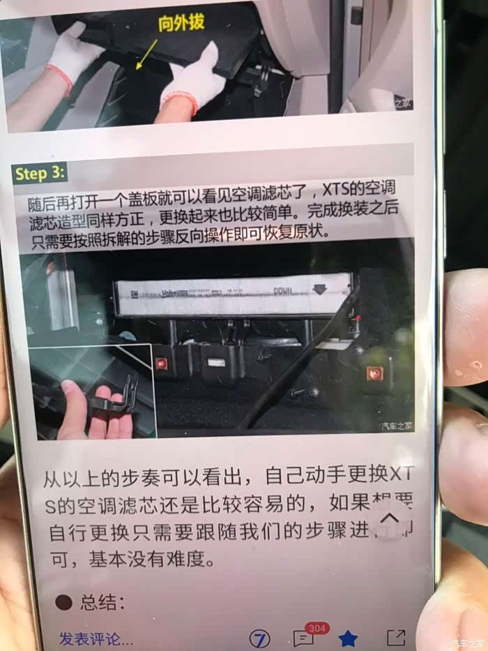 于是,用手机上汽车之家找教程,终于在保养那里面,找到了XTS的空调滤芯更换教程。