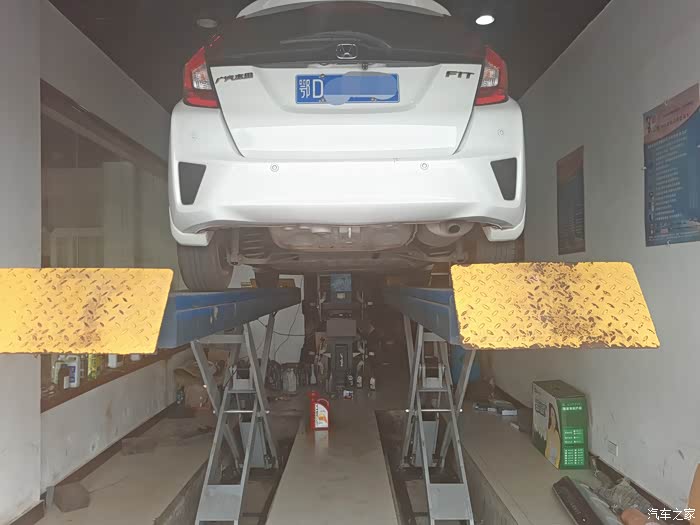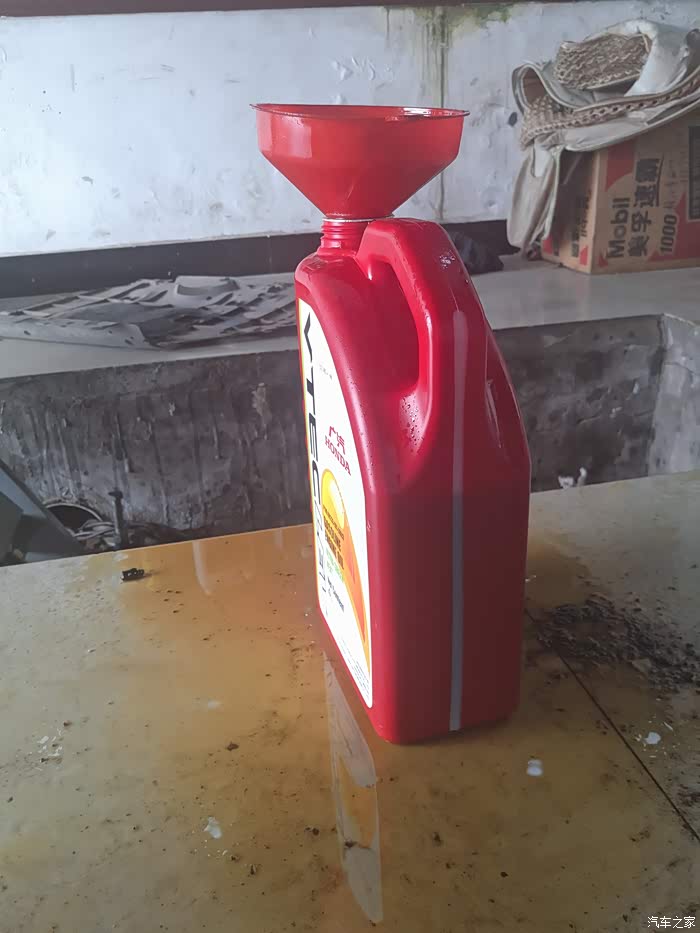 然后我们需要把车升起,拆掉护板,找一个带刻度的空机油桶和大漏斗,等会用来接住放出来的变速箱油。用等量加注法,放多少旧油出去,就加多少新油进来。