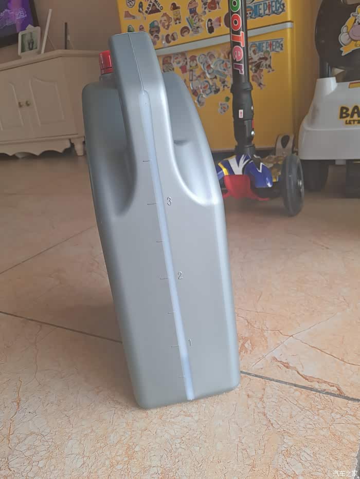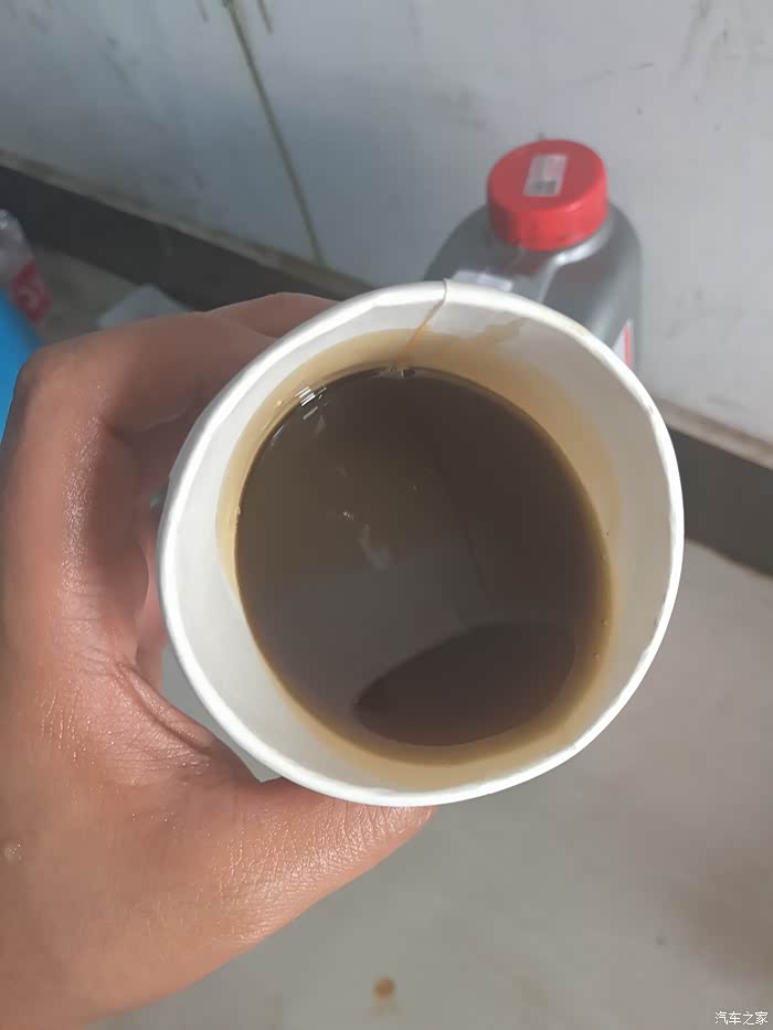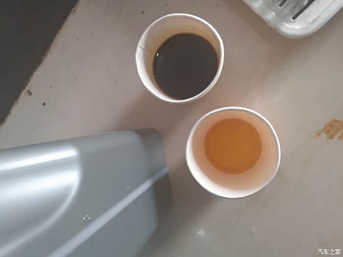 上图是放出的新油和旧油对比图,大家自己感觉吧,等不流了将放油螺丝装回去拧紧。现在可以查看放出多少旧油了,我桶里大概有2.8升,加上洒出去的,我估计有个0.3升左右,所以我决定加3.2升,这是剩下的。