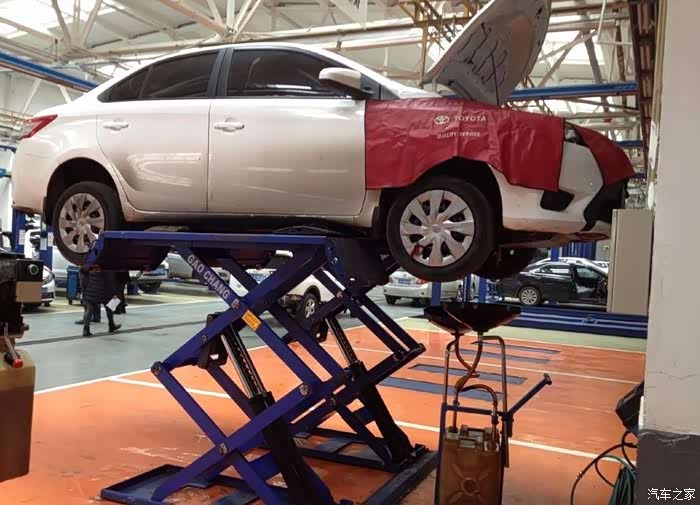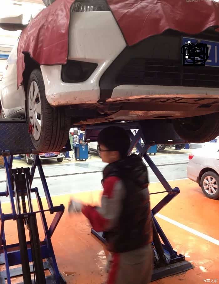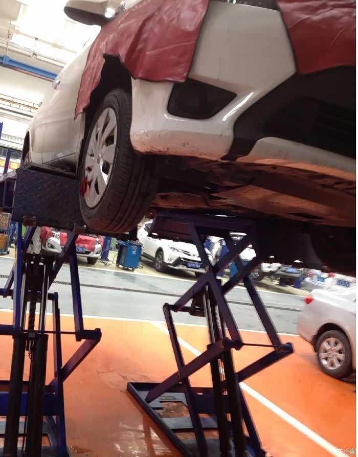 在约定的时间来到4S店,办好签字手续后,直接来到操作车间,很快小威就被驾上千斤顶,升了起来……