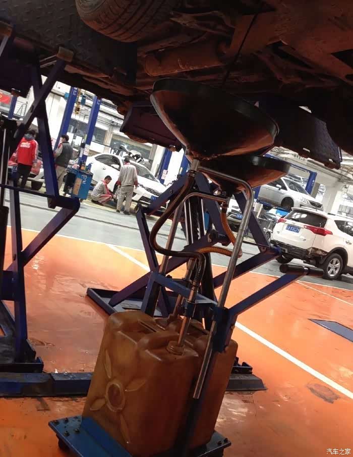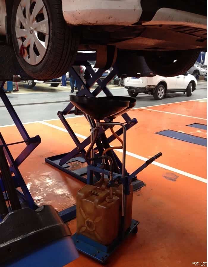 驾起接油桶,看来是要换机油了,这项很关键,爱车在更换机油时,很多汽车4S店都是通过机油底壳的放油螺栓来放出发动机里的废机油。如果不能把发动机里的废油放干净,还需要用专用的吸油器,把机油全部吸出来……