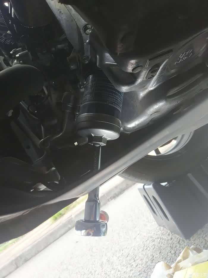 拆油底壳螺丝的时候注意拧松完了要一下子拿开,避免机油冲到手上,拆机滤的时候慢慢松开,让旧油慢慢流出,不要一下子拿开,否者也会全部流到手上。油底壳螺丝和机滤都拆了之后,废机油不怎么滴了,上回油底壳螺丝,然后安装新的机滤,一定要在新机滤上涂抹一圈新的机油,然后用手安装上去,刚好接触底座的时候再拧3/4圈即可,记得用手。这里是让朋友自己上的,油底壳螺丝是我安装的,比原来的那个记号线多拧了一点点,不清楚这个是上次首保4s画的还是原车出厂就有。