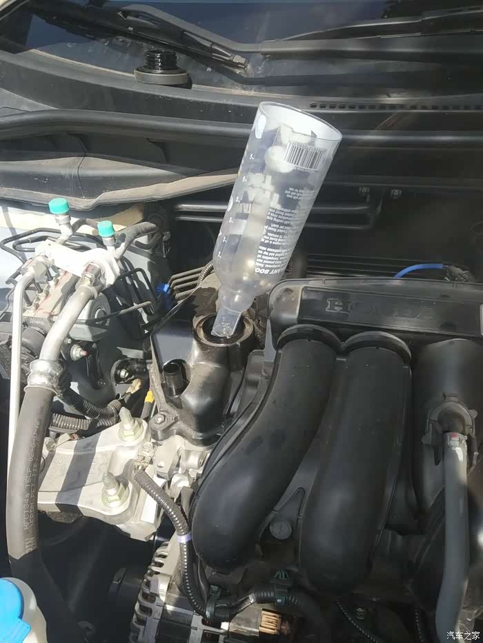 下面就是开始添加新机油,由于不清楚添加量是多少,于是我们一边添加一边检查机油尺,添加到机油尺中线的时候,发动车辆,期间踩踩油门,让新的机滤里面也充满机油,这个时候熄火几分钟再检查下机油尺,降低到最低刻度线,继续添加机油,添加到机油中线,完美,其实只要保持在机油最低和最高刻度线之间即可。看了下5qt(1qt=0.946L)的大瓶机油刻度,大约加了3.2qt刚好到机油尺中线,换算下来,买小瓶1L装其他机油的话,刚好3L即可,下次添加机油就可以一次性加足到位了。记得运转之后检查下油底壳螺丝和机滤底座有无渗油的情况,之后就可以开上路体验下新的机油了。