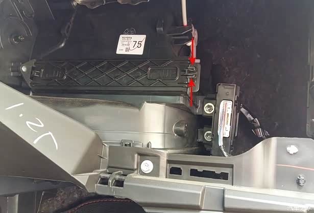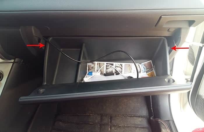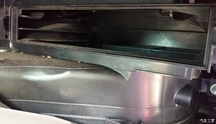 先将副驾驶的,手套箱打开,卡扣位置向中间挤压