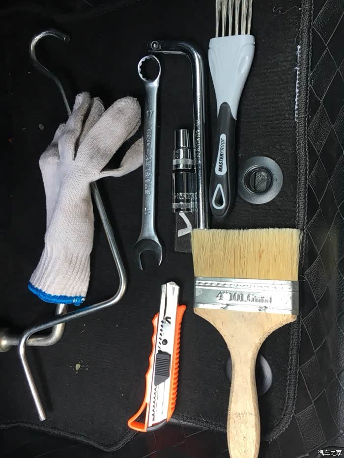 部分拆装工具。铁刷子必不可少,再备两块布,用于擦拭旧油泥。新购入17mm两用扳手。