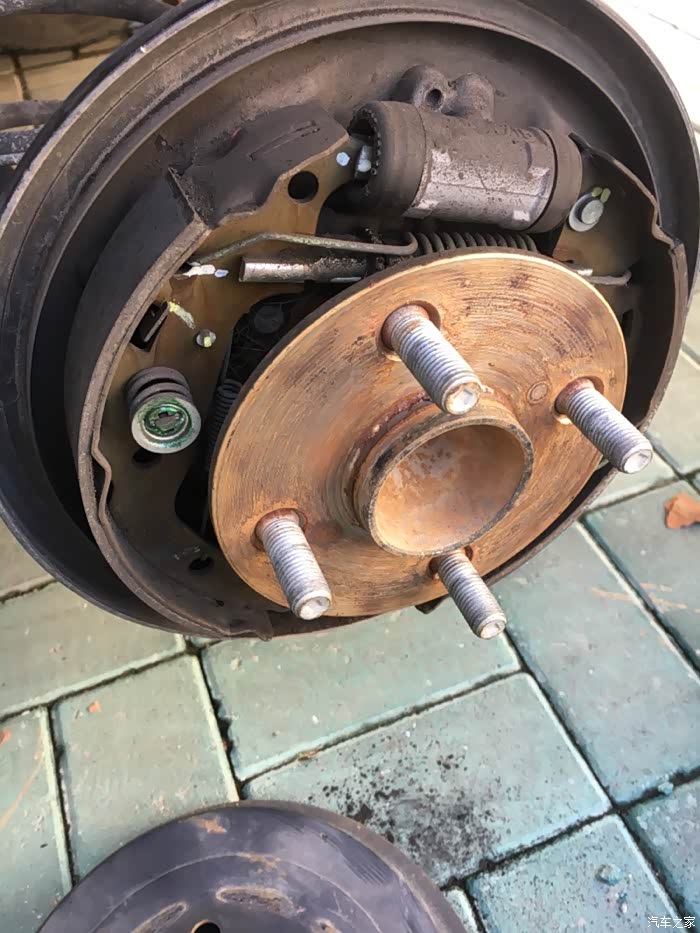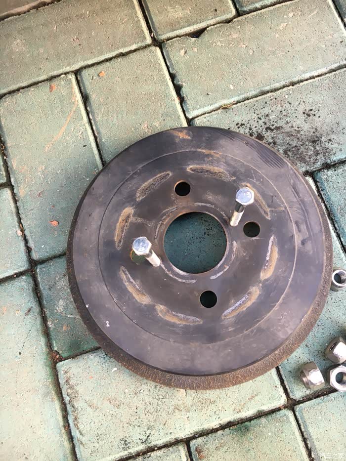 接下来是后轮鼓刹,两根6mm螺丝棍,拧孔里,顶松动刹车鼓,拆下来。