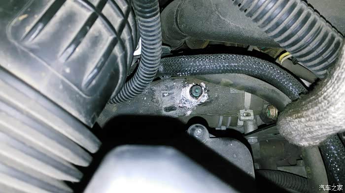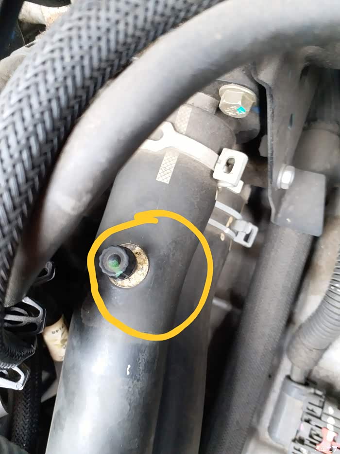 最近动手保养,换空滤时发现上水管排气口已经被腐蚀,有点鼓包。就是下面这个地方。