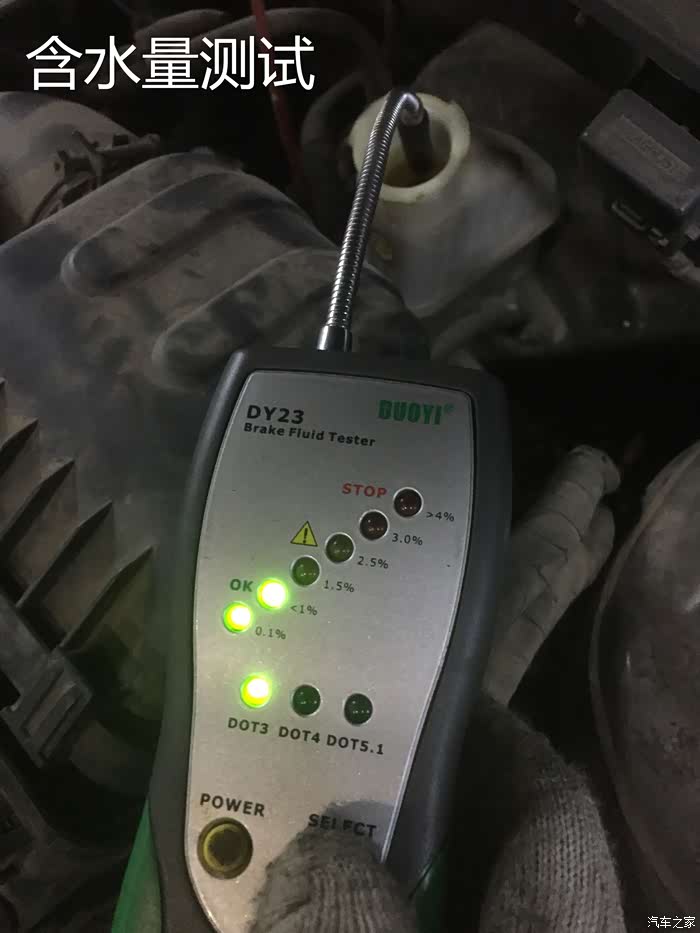 即使是保养,那么肯定是需要对全车的油液进行检查的。这是在检测刹车油的含水量,用检测仪可以直接读取刹车油含水量的多少,进而对刹车油的质量是不是需要更换做出判断。还好这台新胜达的刹车油含水量仅仅是还没有达到1%,无需做出更换。