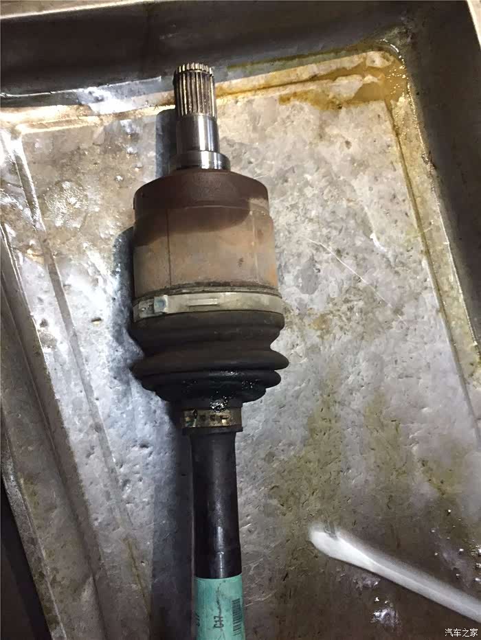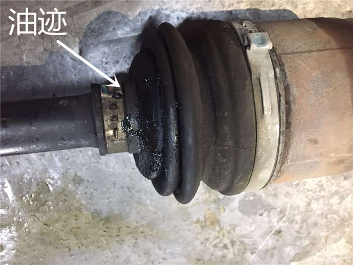 已经破损的球笼套,飞溅出来的球笼油会喷的到处都是。球笼油是润滑的保证,如果失去了球笼油。半轴会发出刺耳 的噪音,用不了多久,这根半轴会因为持续的高温和重度的磨损也会废掉,看到球笼套破裂,一定要及时的更换,要不然到时候更换整根半轴就得不偿失了。