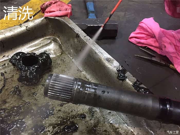 半轴上面附着的旧球笼油必须清除掉,主要的原因是球笼油在半轴内部因为处在底盘根部,会导致球笼套的内部进水,球笼套进水之后跟球笼油混合到一起,直接导致了球笼油的失效,乳化现象,球笼油就废掉了。所以每次更换球笼套的时候都必须将球笼内部残留的油液清洗掉。