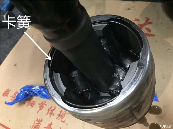 圆形卡簧安装的位置,主要也是锁住三枢轴的,不让它出来跟内球笼分离的。安装要求跟内卡簧是一样的。
