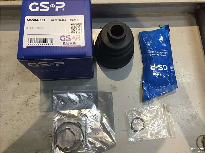 半轴球笼套的修理包,内卡簧,球笼油。球笼套。还有卡子。这是一个副厂的修理包,因为原厂的实在是不太好找,价钱又很贵,副厂的配件很多,价格又实惠,对于一个防尘套来说,我觉得还蛮合算,就采用了副厂的配件。