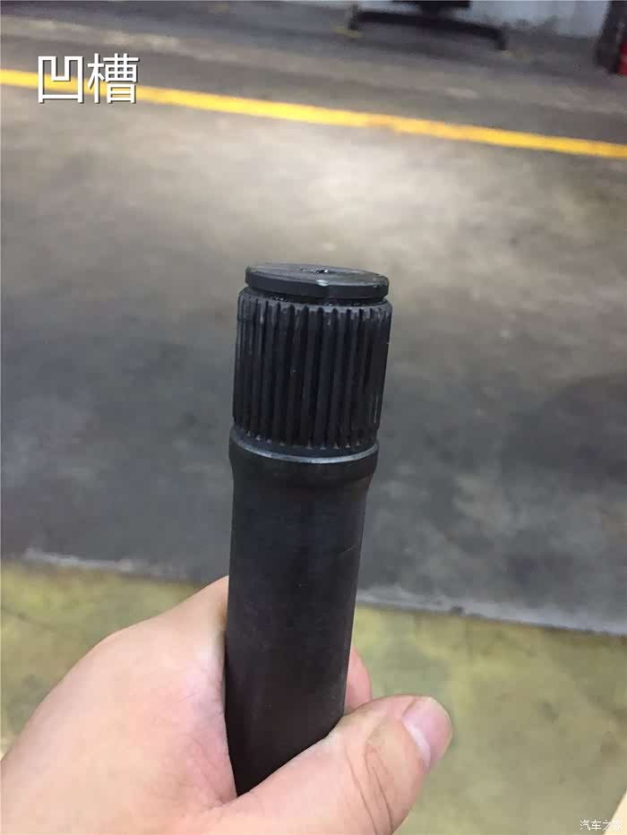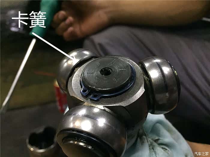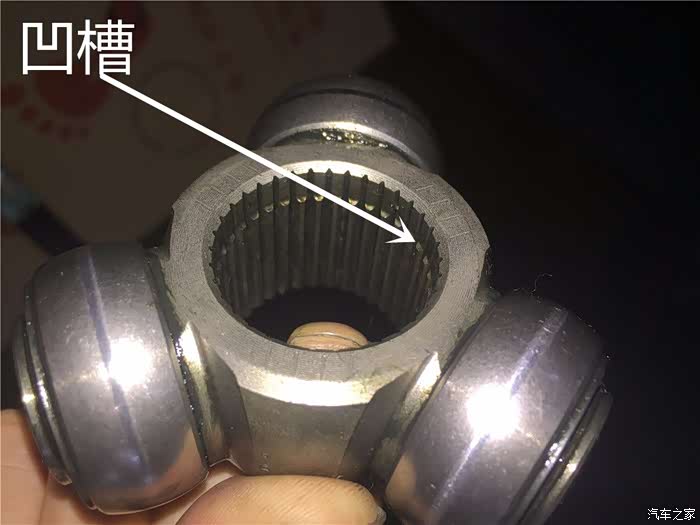这就是传说中的三枢轴了,凹槽的部位要对准半轴的内侧,因为这个三枢轴是有安装方向的,安装的时候一定要凹槽朝向半轴的内侧。要不然会导致这个三枢轴安装不到位, 卡簧无法锁紧的状态,造成巨大的安全隐患。
