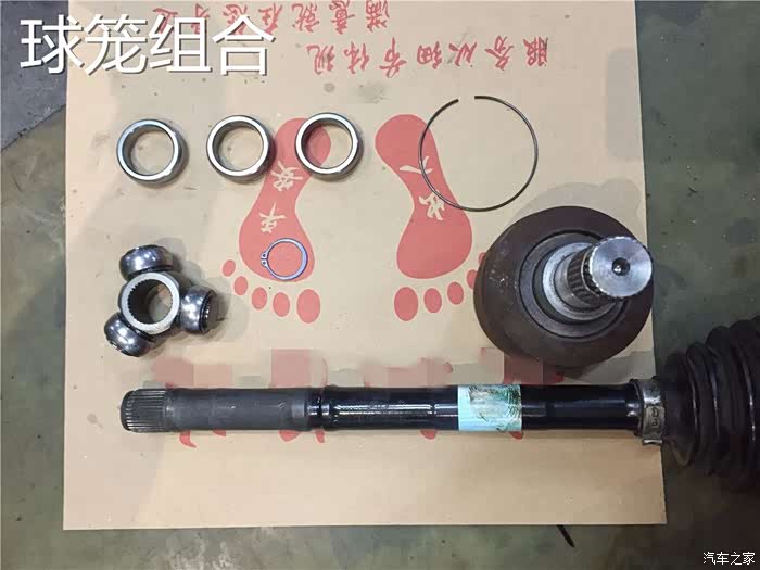 拆下下来的半轴总成,破损的内球笼。你要是想知道它具体是怎么坏掉的,那真的是有一百种原因了,一个飞起来的高速运动的小石子也会导致球笼套的破裂。内球笼采用了三枢轴式等速万向节的设计和外球笼是完全不一样的,正因为如此,才导致了它拥有,较高的行程,能够正常的转弯,主要还是来自于这个三枢轴式等速万向节的功劳。