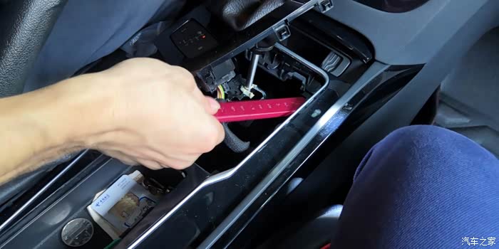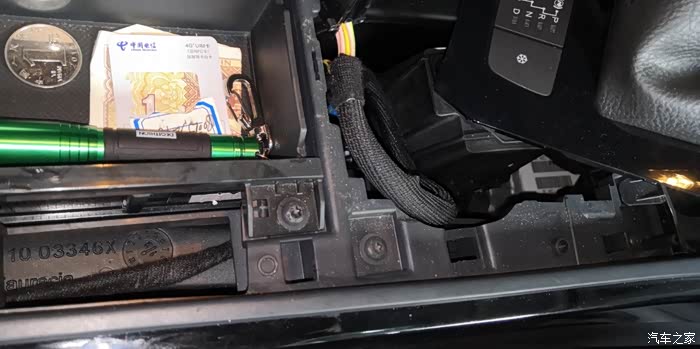到这里要用螺丝刀拧开固定螺丝,才能取出前面的点烟孔接线。