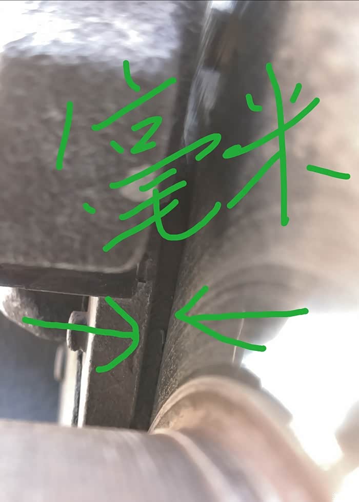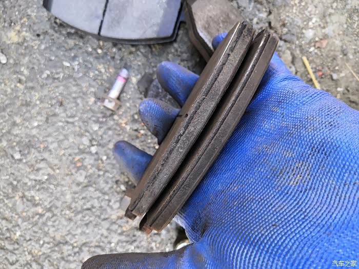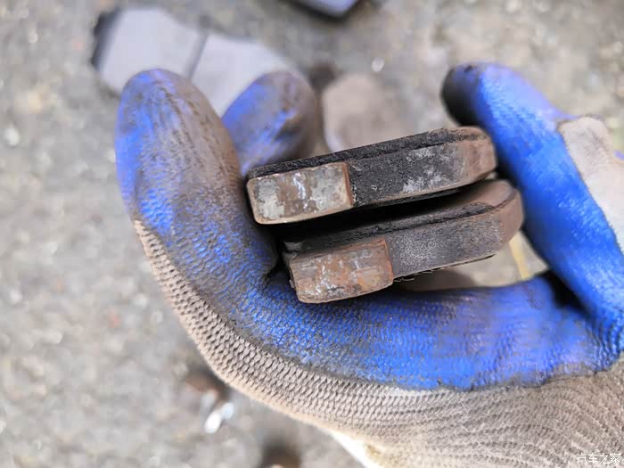这是左前轮的刹车片,可以看到还有不足一毫米的厚度,但这是上面那一部分的厚度,刹车片磨的是不平的,见下图