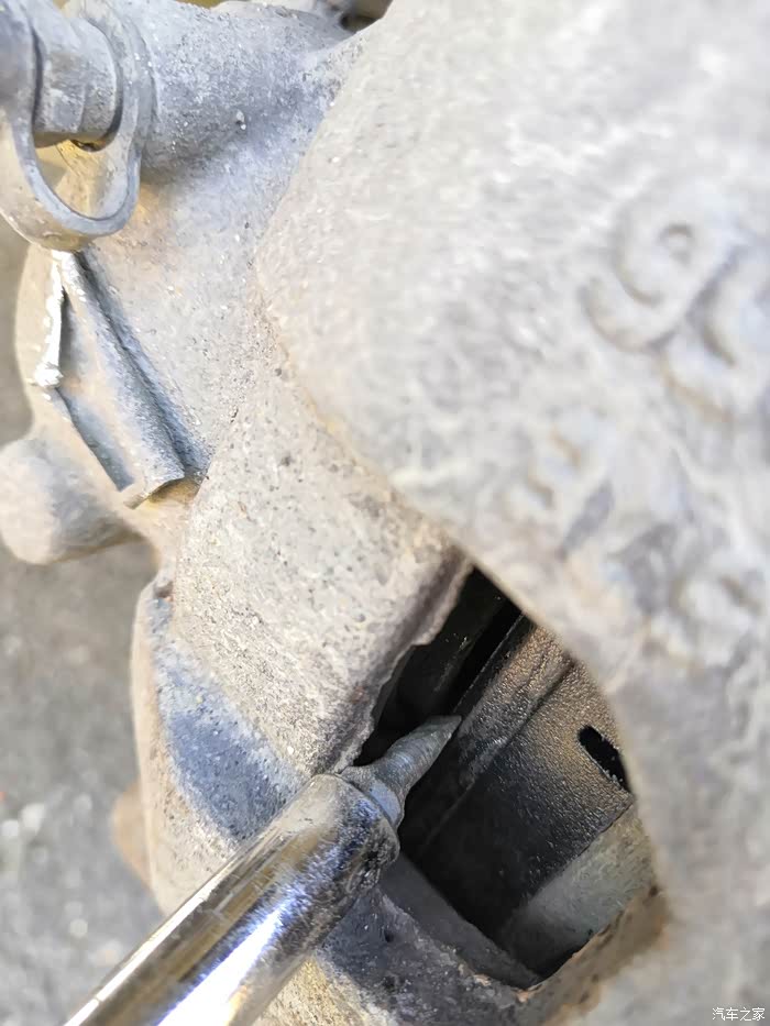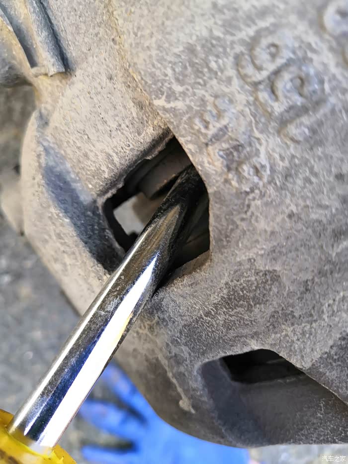 撬活塞能遇到两次,一次是抬起刹车钳的时候,可能会遇到阻力,这个时候就需要先用一字螺丝刀撬一下活塞。