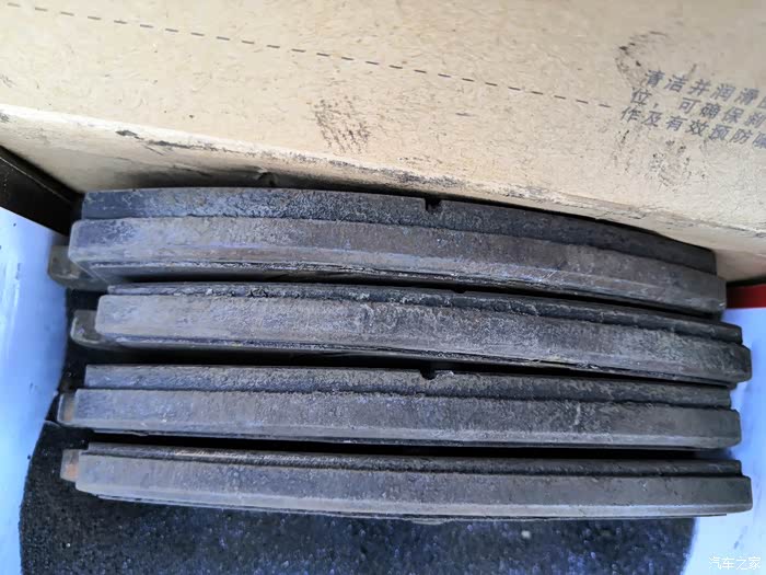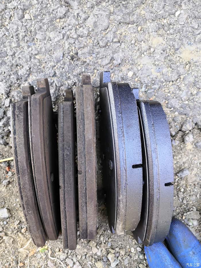 这是左右前轮刹车片的对比,可以看到,右轮刹车片的凹槽还在,这据说是凯越的通病。从上往下数,1,3是右前轮的。