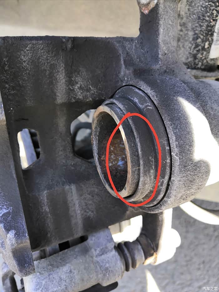 看到活塞边缘的有锈的部分了吗?这部分是和刹车片没有接触的,露在外面的部分,所以撬活塞的时候有很大的空间,安全的,不用担心。