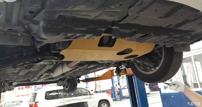 如图,黄色的板子就是上次保养的时候,加装的发动机护板,铝合金材质的,据说很轻,保护发动机,还不会给车身带来过大的压力。
