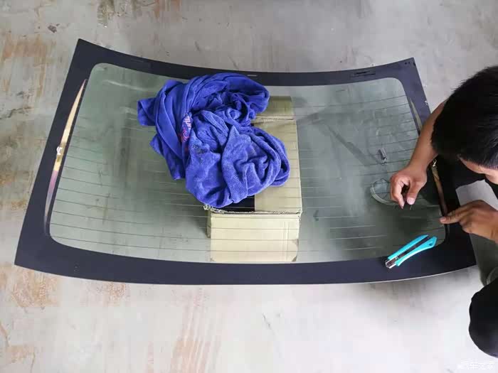 6、将新的后挡风玻璃安装到后挡风玻璃框上,调整上下左右的位置,然后用透明胶带贴在玻璃和玻璃框的四周,防止玻璃移位。