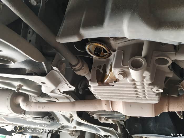 换完空调滤芯,直接上了升降台,开始准备换机油滤芯,我想要换全合成的丰田专用机油,他这店里没有,需要去其它店里调货,无奈,店小品种不全啊,只能等着了。趁着等的时间我仔细观察了一下底盘的使用情况。基本上都是正常的,虽然会有些小磕碰,但是没有出现渗漏或者磨损的情况。不影响安全使用。