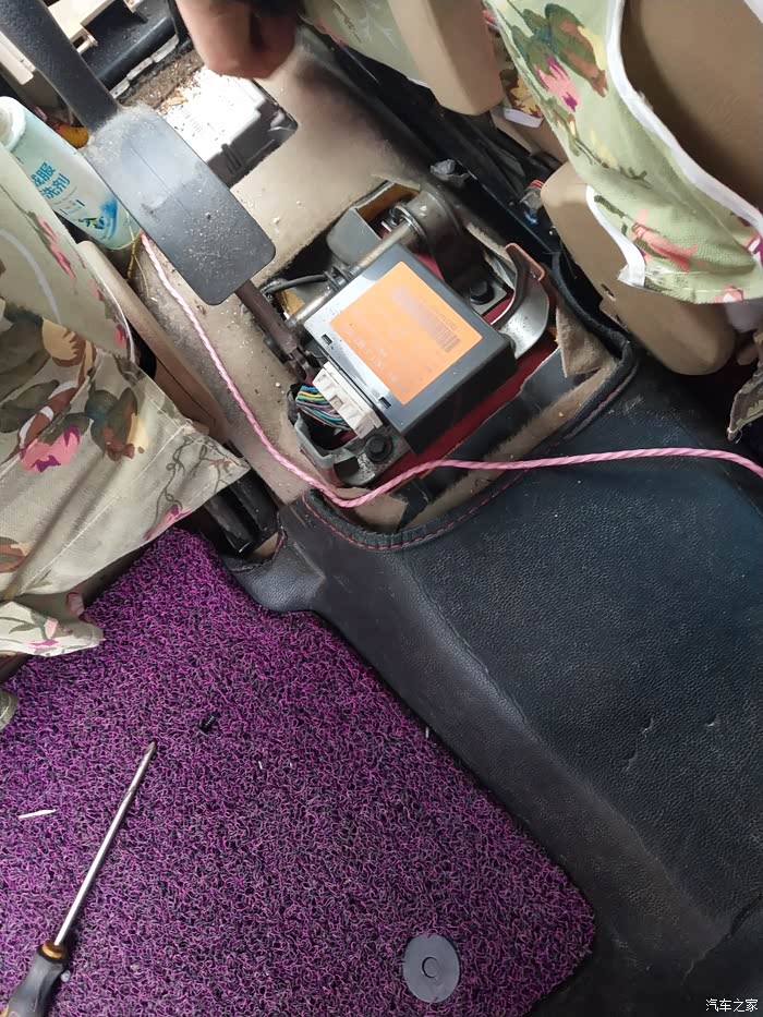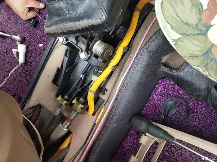 拆下手护箱。粉色的线是我接给后座手机充电用的。