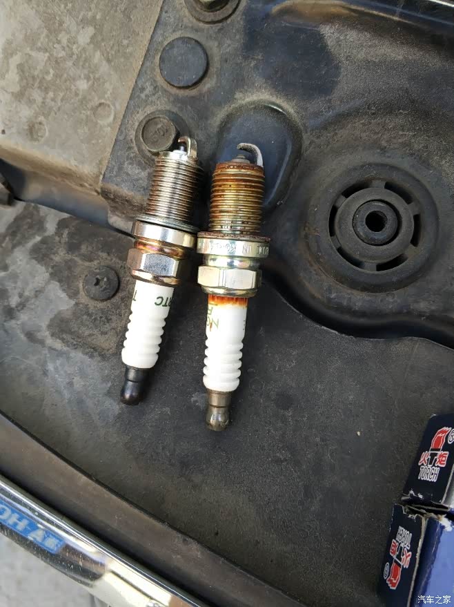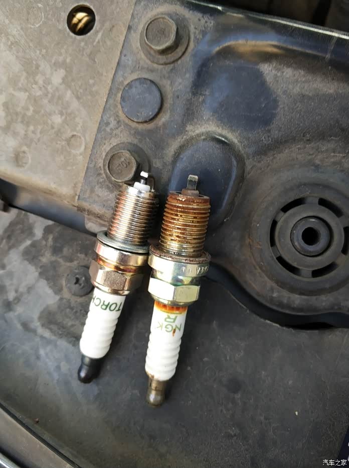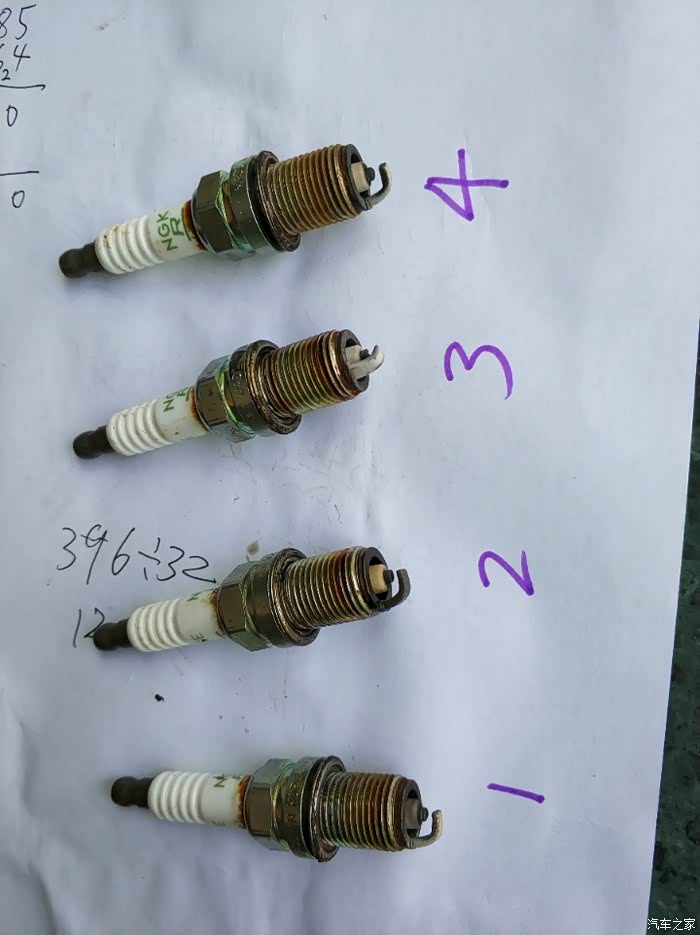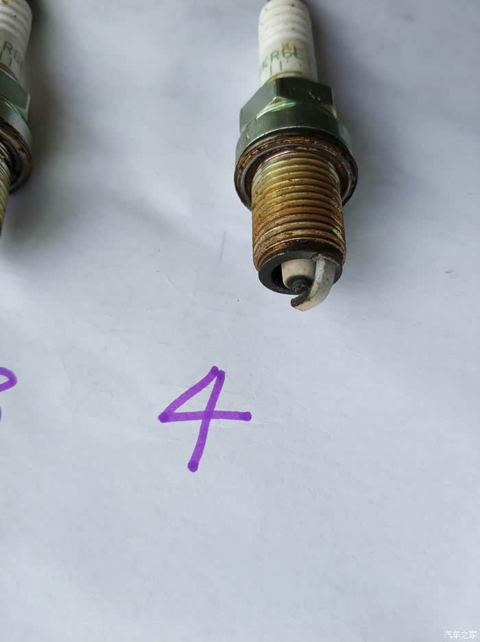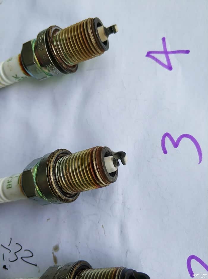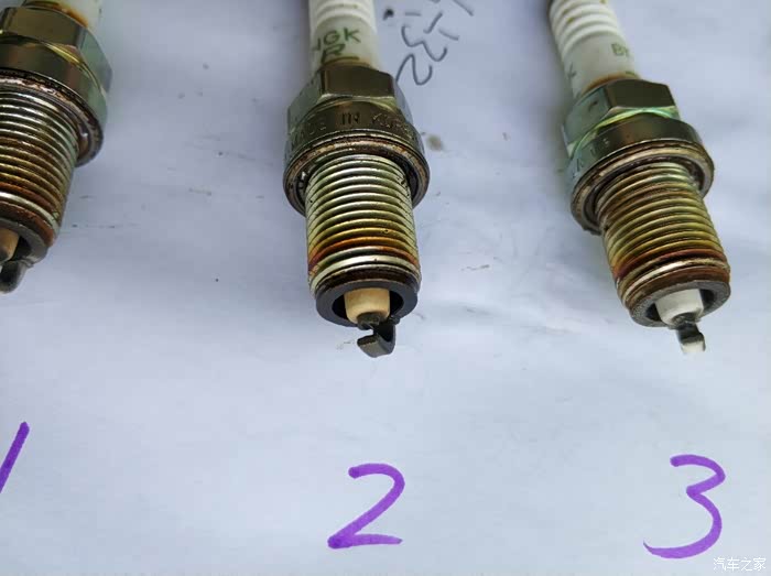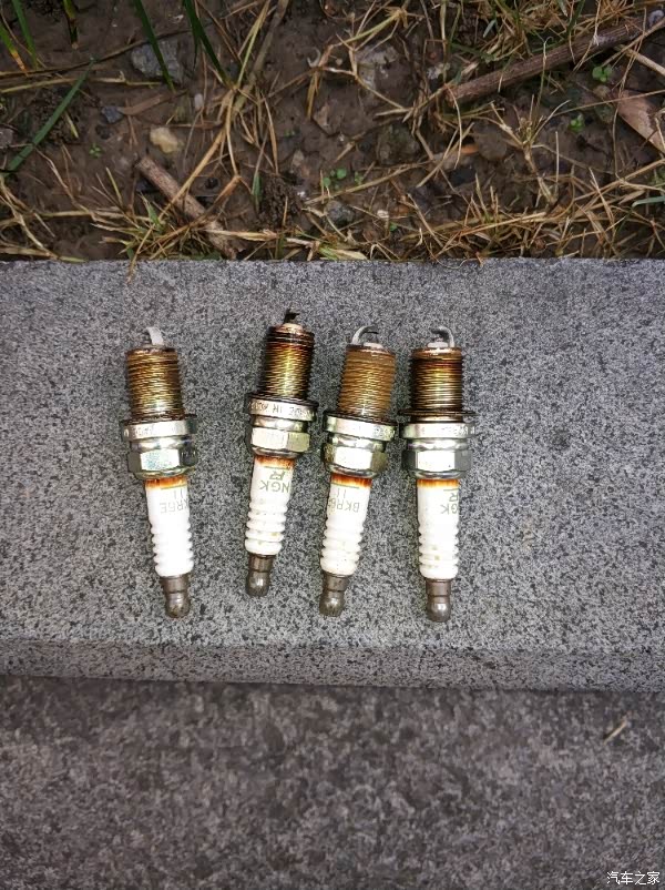 拆下的四个火花塞,从左到右(1、2、3、4缸)。二缸气门室盖垫有渗机油现象。