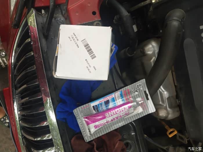 拿出新的节温器和密封胶。胶水让掌柜送的。