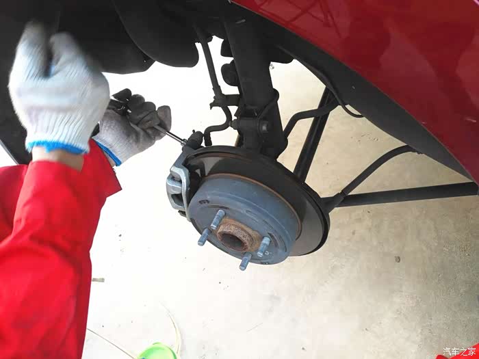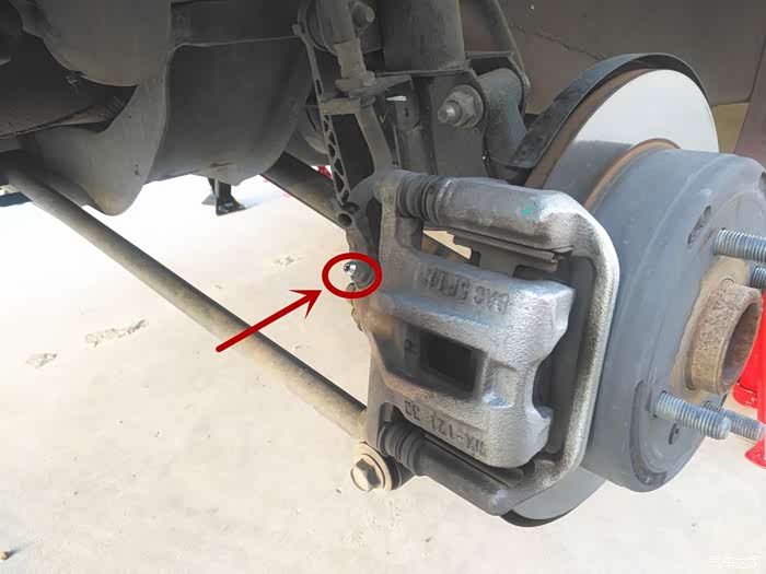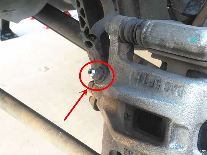 轮胎卸掉后,志俭给我讲解需要把刹车的排气阀松开,然后用真空泵连接排气阀将油抽出,前面注入新油,这样不会进入空气,也不会污染环境,大神还是环保主义者。排气阀就是图中红圈内的小东西。