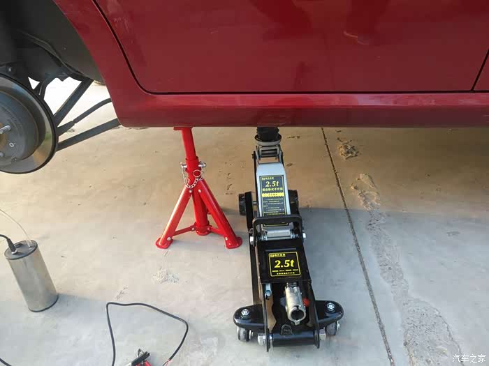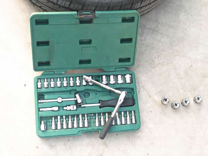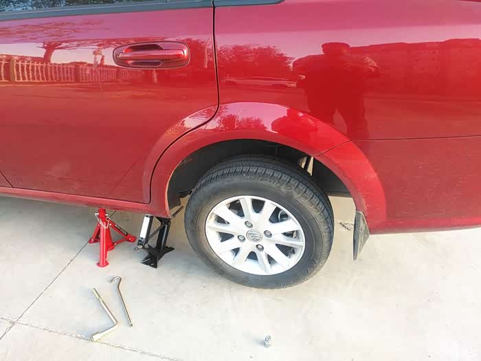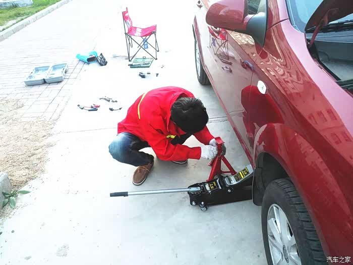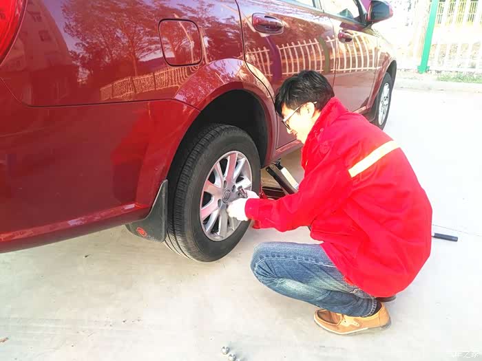 志俭的底盘支架!用千斤顶和支架双保险,这样更安全。这是我原车带的千斤顶。大神的比我的这个高级多了。每个轮胎志俭都用扭力扳手拧了一下,要不我真卸不动啊。大神的小体格子还挺有劲的!