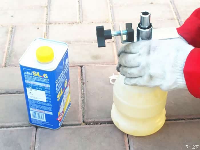 开始抽车油壶里的废刹车油。