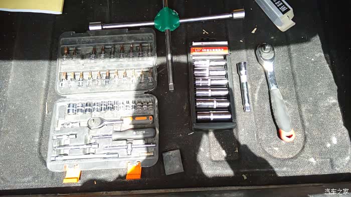 用到的工具,从左到右依次是:1/4工具套装、十字扳手、1/2长套筒组合、1/2连接杆、1/2飞扳手。全套工具不到200元,可以干很多活,换个火花塞、刹车片啥的很容易。还有随车千斤忘了拍照了。