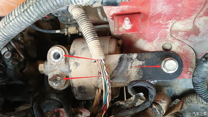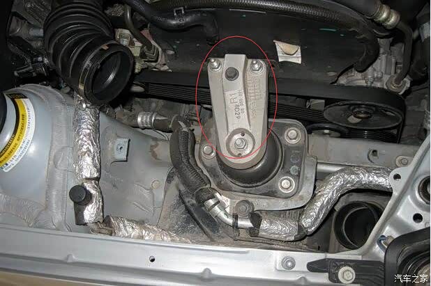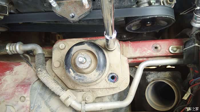 用千斤顶起发动机,然后拆掉机脚垫上部的三颗螺母,前两个19的,后面的是14的
