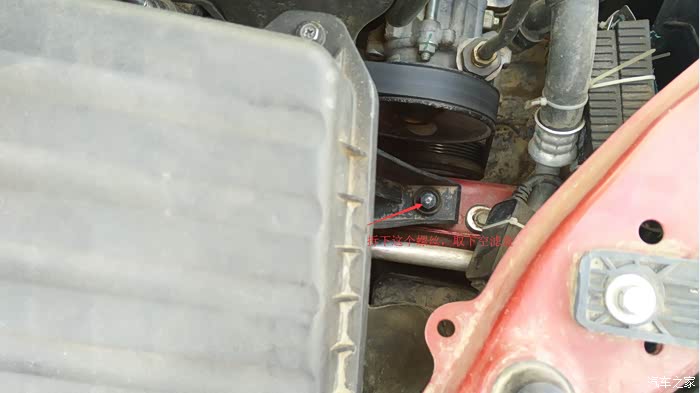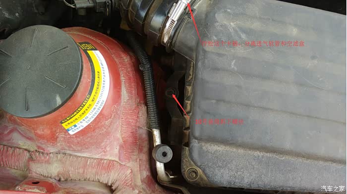 拧松银色的卡箍,分离进气软管和空滤盒,然后拆掉下面的螺丝。