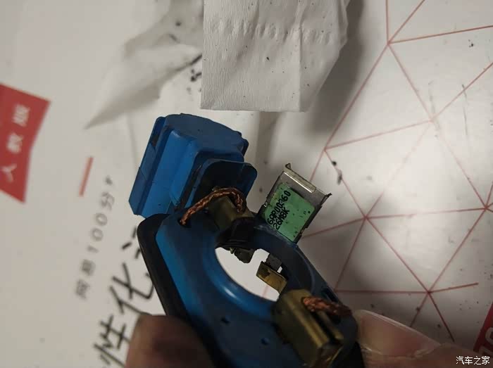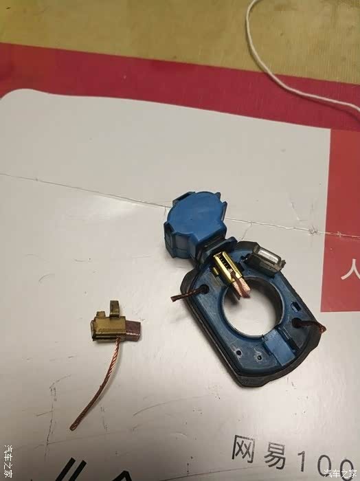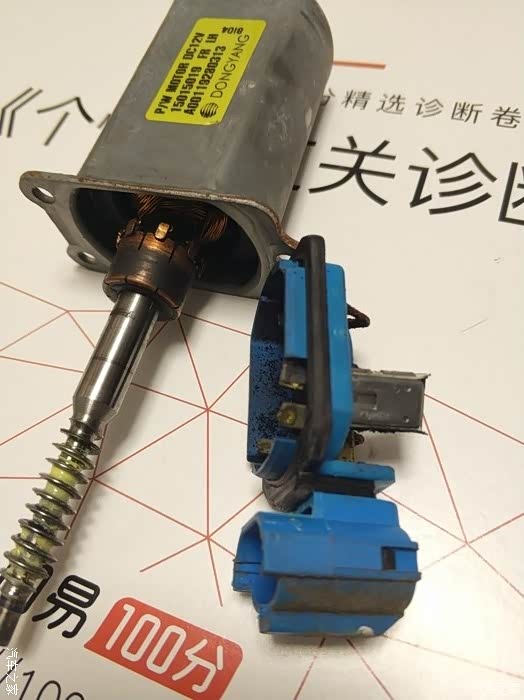拆除3颗螺丝后,先拔出电机外壳,顺时针拧出电机转子,再拆下碳刷支架(图中蓝色的那个,右侧是连接插头的)。
