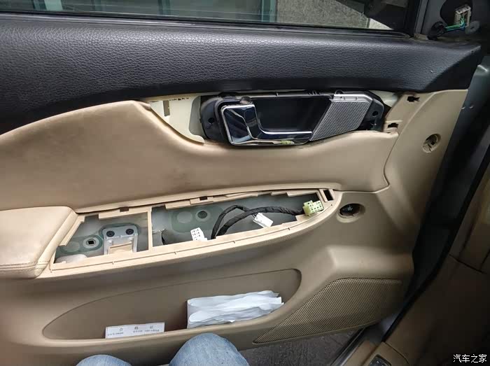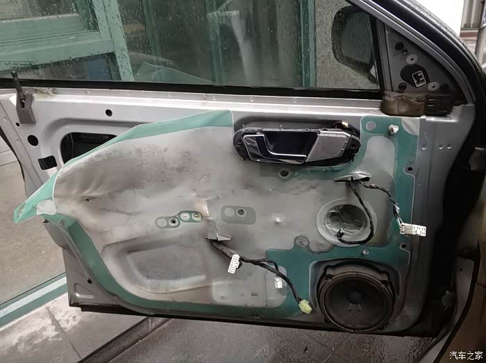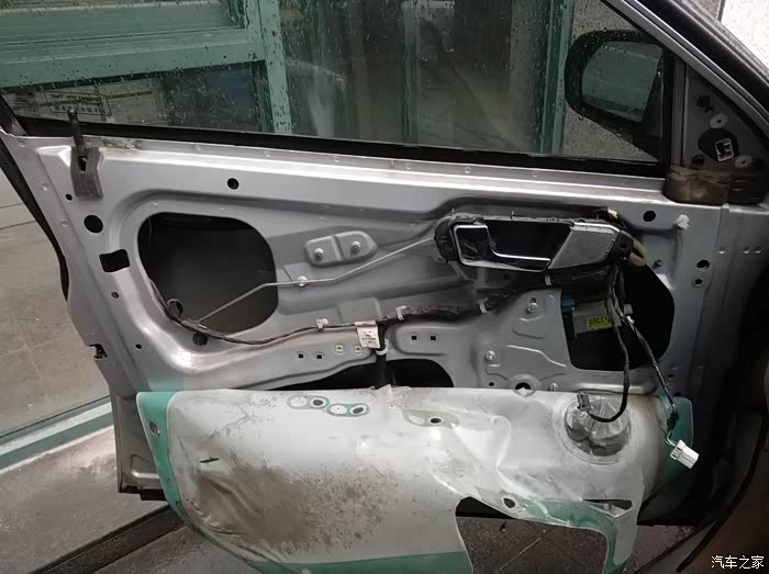 拆除拉手银饰板、后视镜三角饰板、升窗开关、后备箱锁开关、和一颗塑料螺丝后的样子。到此连接门板的东西基本拆完,内部还有三个绿色卡扣,左侧两个右侧一个。用力向外扳就可以解锁这三个卡扣,然后门板向上抬就拆下来了。