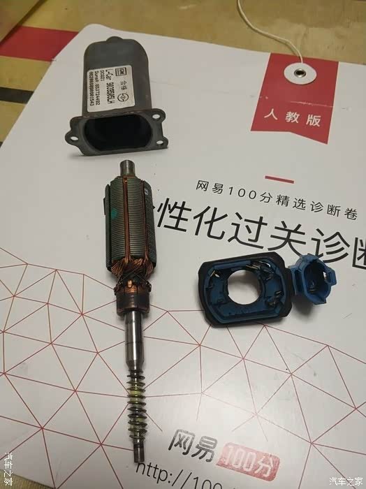这里主要是转子和碳刷要一起组装好后再装回,而且转子是逆时针拧进去的,然后再装电机壳,装上3颗螺丝。先插上电机插头和升窗机开关试一下,成功,玻璃可以升降了。