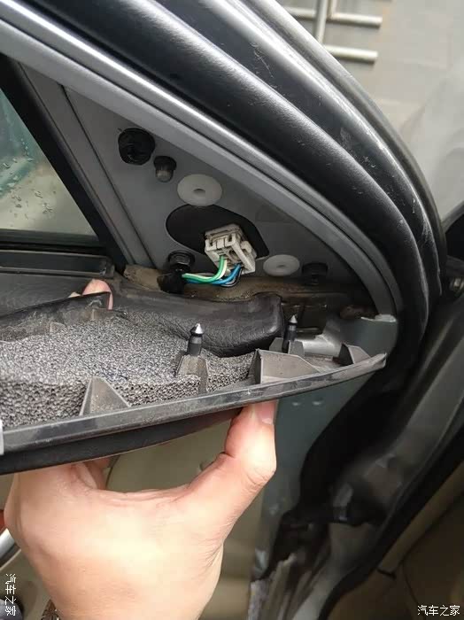 图中我把后视镜插头及固定升窗开关的小铁片先拆下,因为防碍防水膜撕下来。