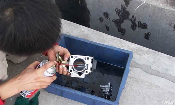 这个工作人员在清洗节气门的另外一部分,用的是专门的清洗剂~